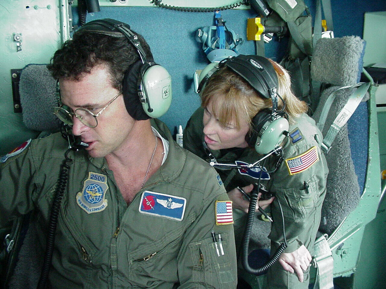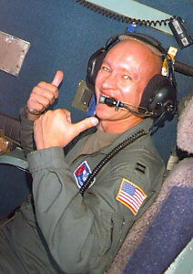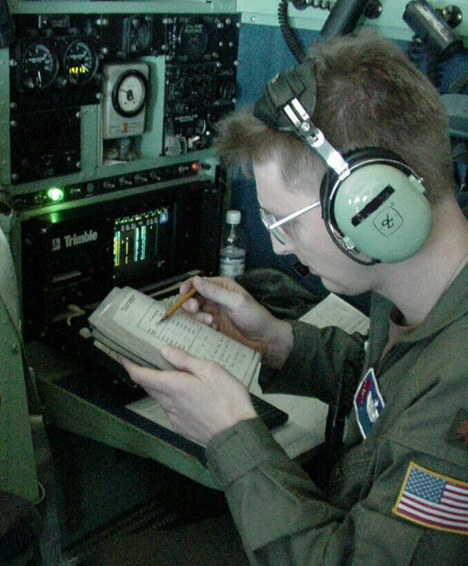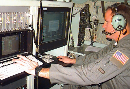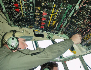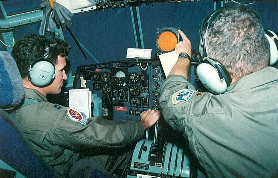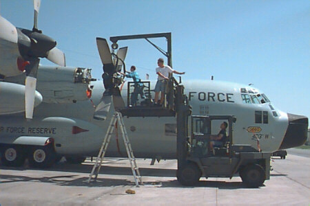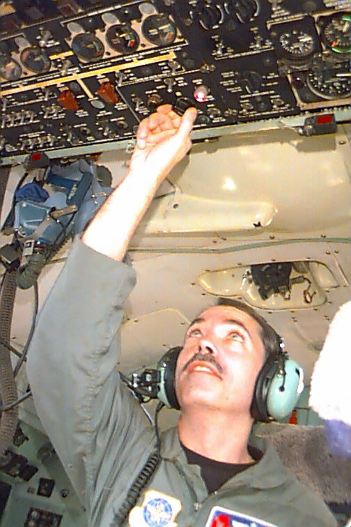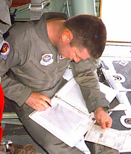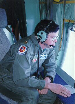 Can you imagine a more thrilling part-time job? Our crews have six members: two pilots, a navigator, flight engineer, and two weather specialists. All of us are Air Force Reservists; half are full-time for instant recall, while the other half take vacation from their "regular" jobs, and come from 18 different states and Guam to fill out our crews. We're backed by a large crew of Maintenance experts, who keep our airplanes flying-- the real unsung heroes of our operation.